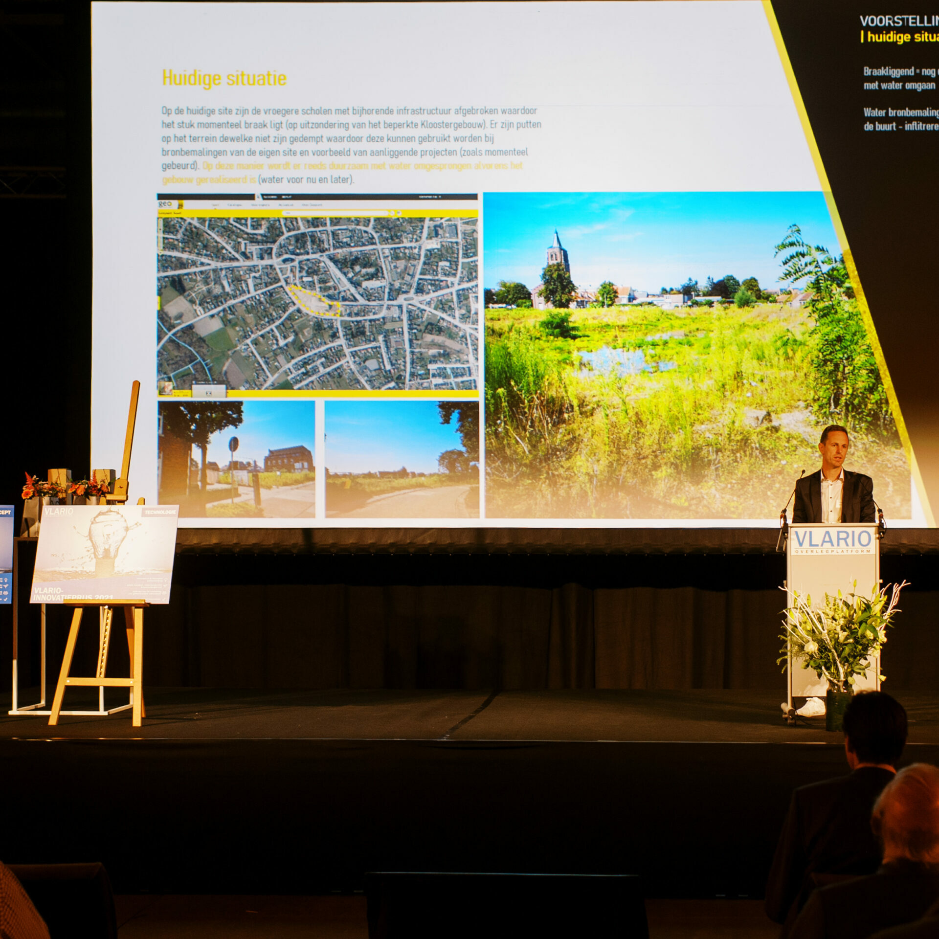 Vincent Wolfs, voorzitter van Werkgroep 2&3 van VLARIO heeft het groenblauwpeil voorgesteld en alle deelnemers van de VLARIO-dag uitgenodigd om deze tool te gebruiken. VLARIO, de Vlaamse Confederatie Bouw en het Departement Omgeving hebben dit instrument samen ontwikkeld waarmee iedereen kan nagaan hoe een woning of perceel scoort op blauwe en groene elementen. Deze online tool kan met concrete tips ook helpen om een perceel klimaatbestendiger te maken (www.groenblauwpeil.be).